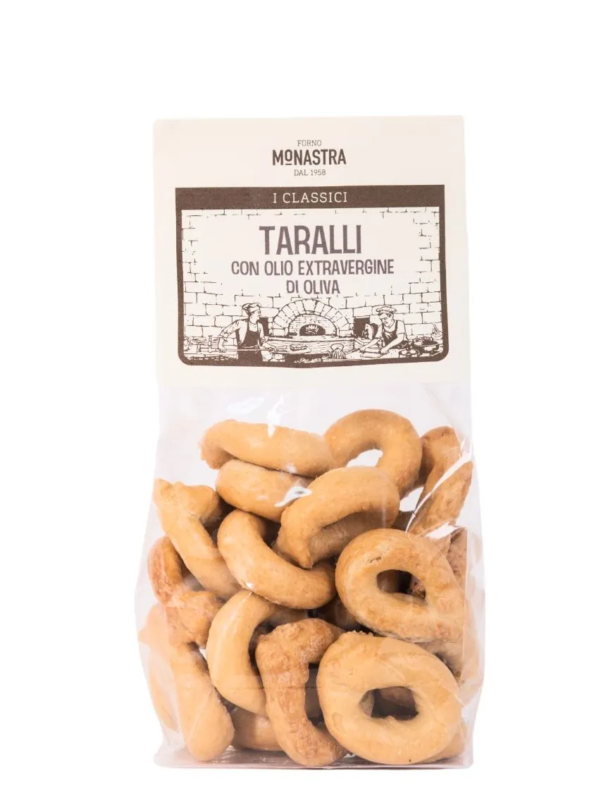 Tax includedTaralli with Extra Virgin Olive Oil are a perfect snack for any time of the day. Thanks to their crunchiness and delicate but characteristic flavor, they can be eaten alone as a light snack or together with cheeses, cured meats and pickled vegetables to enrich aperitifs and starters.