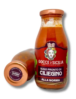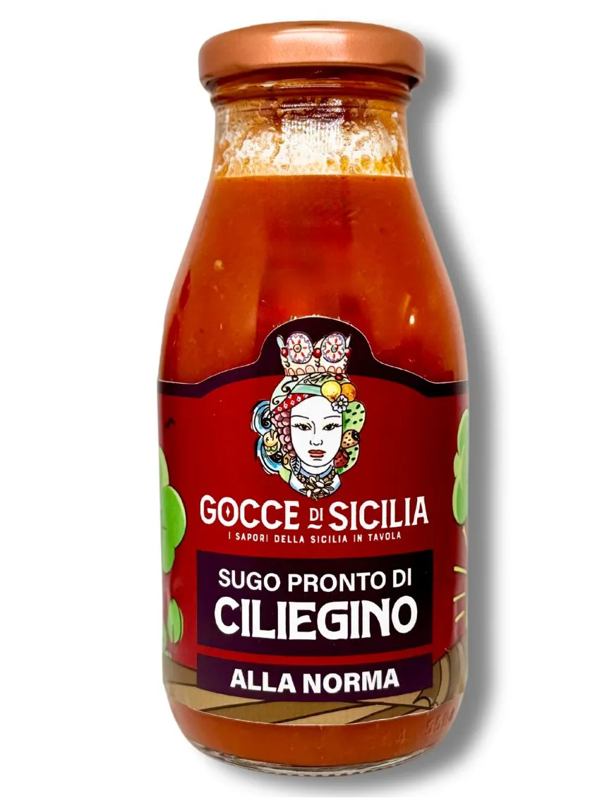Delicious ready-made sauce made of very sweet cherry tomatoes, with fresh basil and aubergines, grown in the province of Syracuse, seasoned only with Extra Virgin Olive Oil, sea salt and garlic