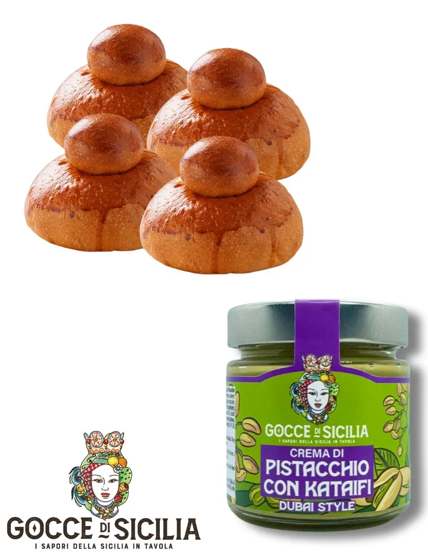 Tasse incluse Spedito entro 1 giorno lavorativo.La confezione regalo contiene: una golosissima Crema al Pistacchio Kataifi Dubai Style, buona e croccante. E con 4 soffici brioche col "tuppo" siciliane da farcire.