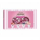 Assortimento di confetti con mandorla tostata ricoperta da cioccolato bianco assortito nei gusti fragola, amarena, mirtillo, cheesecake ricoperto da un sottile strato di zucchero, in diverse sfumature di rosa. SENZA GLUTINE