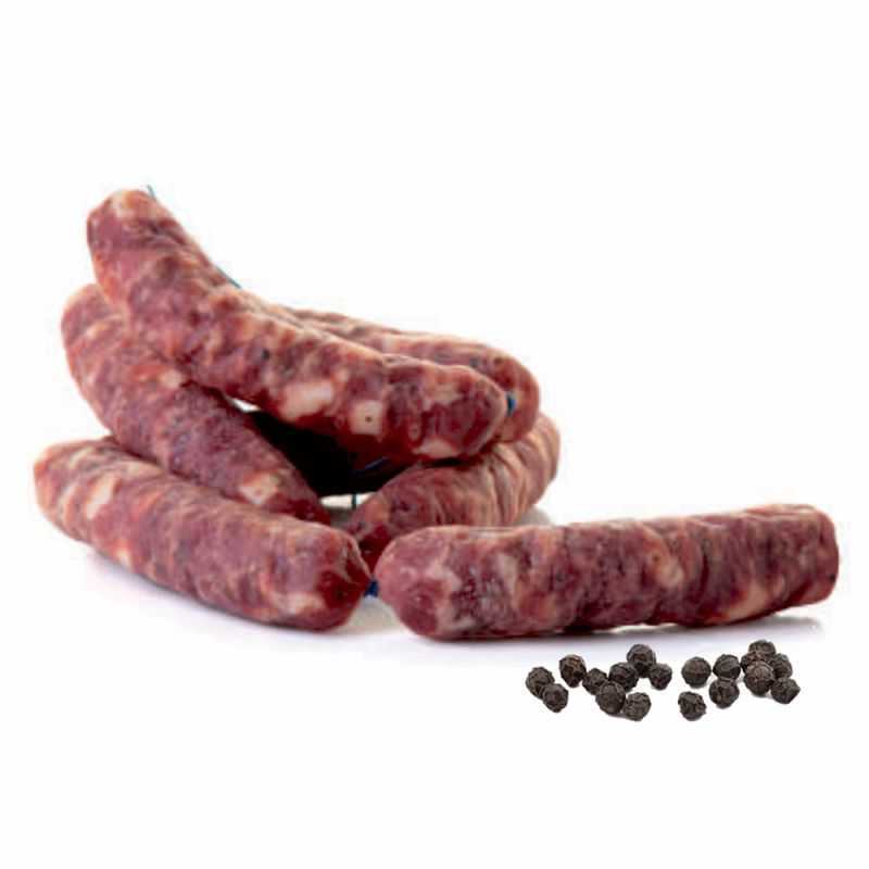 Salsiccia siciliana originale, taglio a punta di coltello, senza finocchietto e aromatizzata al pepe nero.